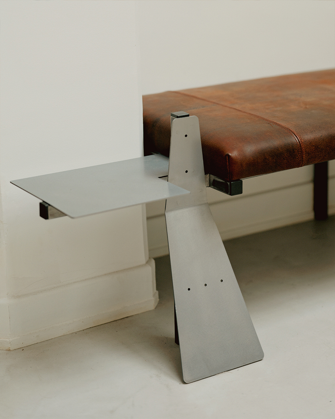 We designed a range of furnitures for their showroom : a Camel table blending raw steel and walnut wood, a built-in Camel bench upholstered in Longchamp calfskin leather, and steel garment racks.