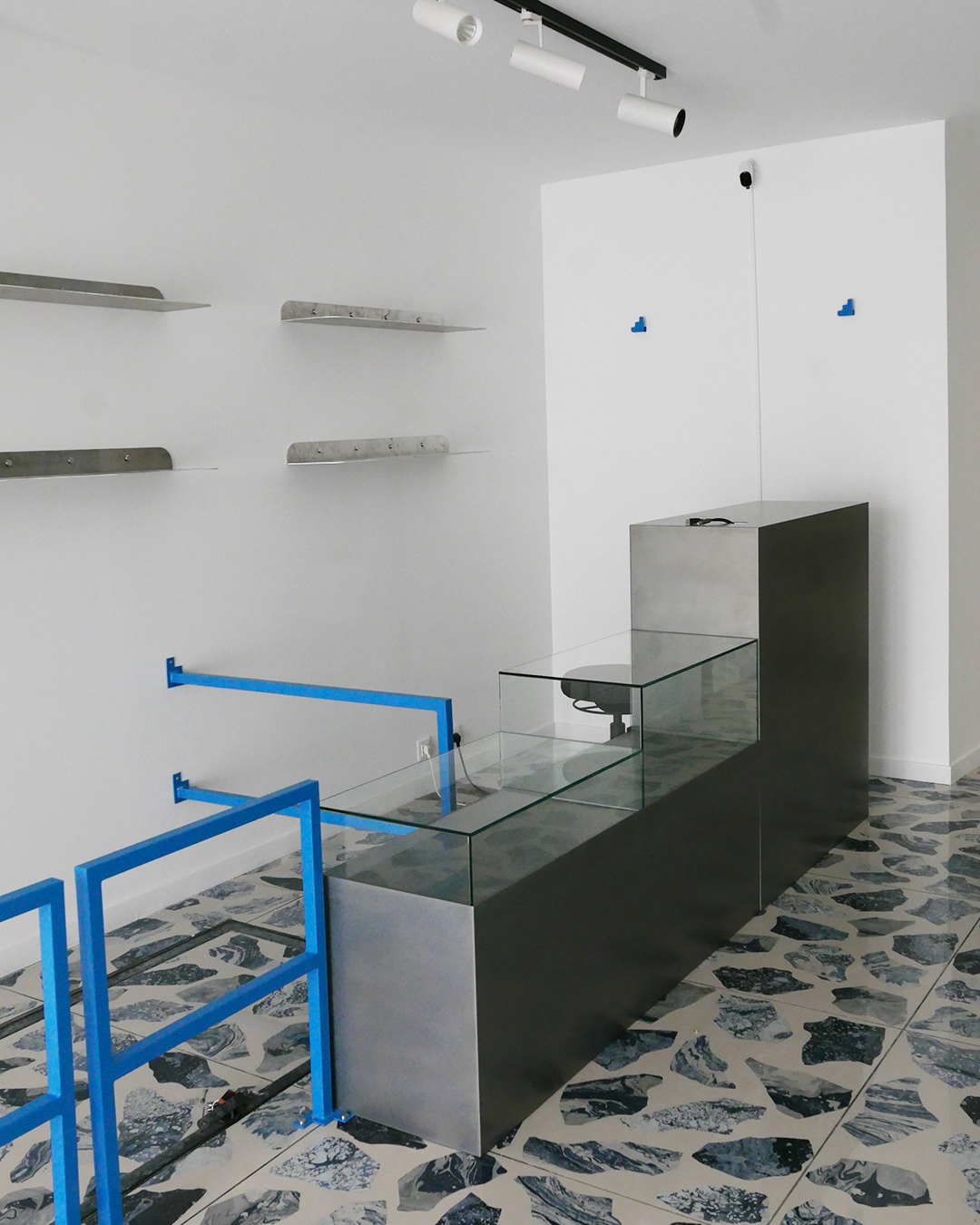 It required a global refurbishment to create signature and functional items. Mixing metal and glass, this is the third boutique Tom has designed for this retail company.